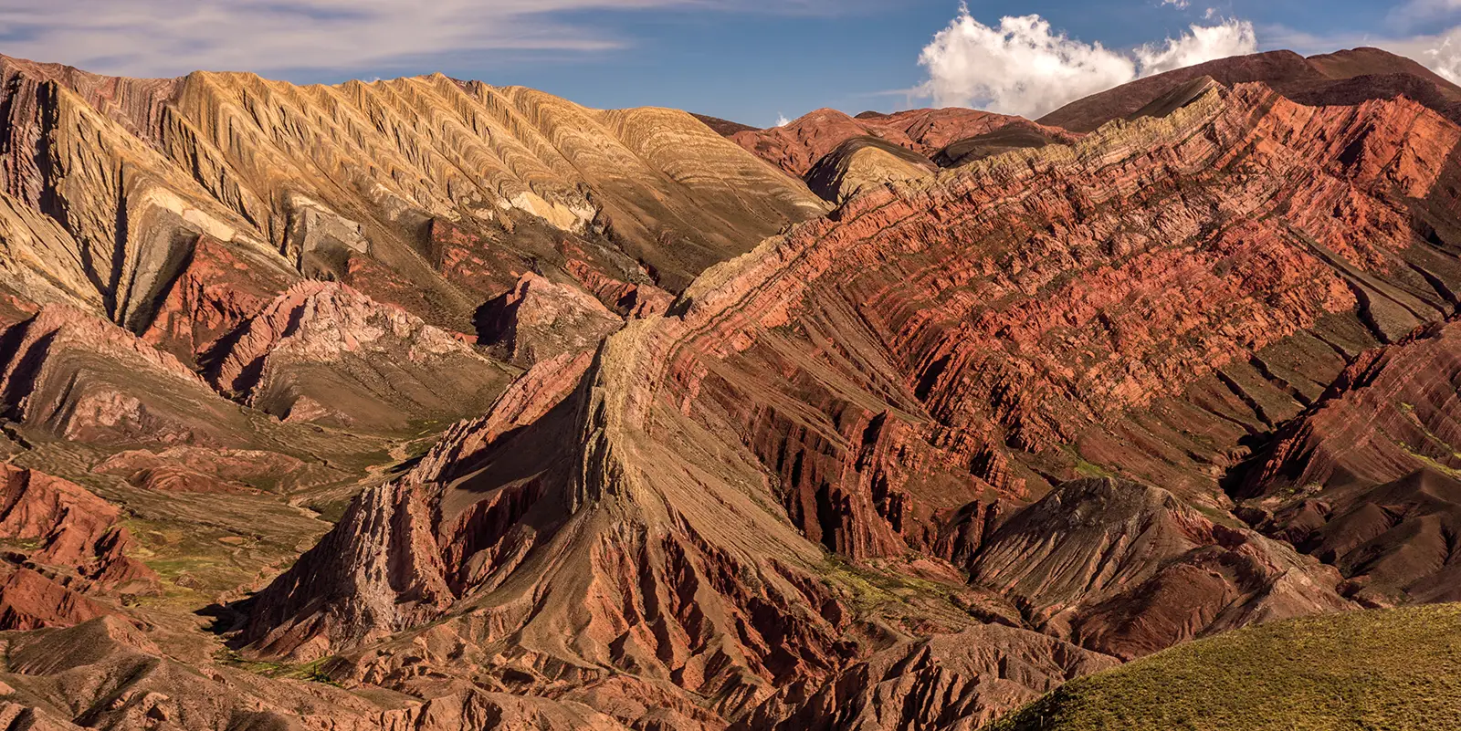 El relieve de la Quebrada es una lección a cielo abierto. El famoso cerro de los Siete Colores, en Purmamarca, exhibe franjas ocre, verdes y violeta producidas por milenarias capas sedimentarias expuestas por la erosión.